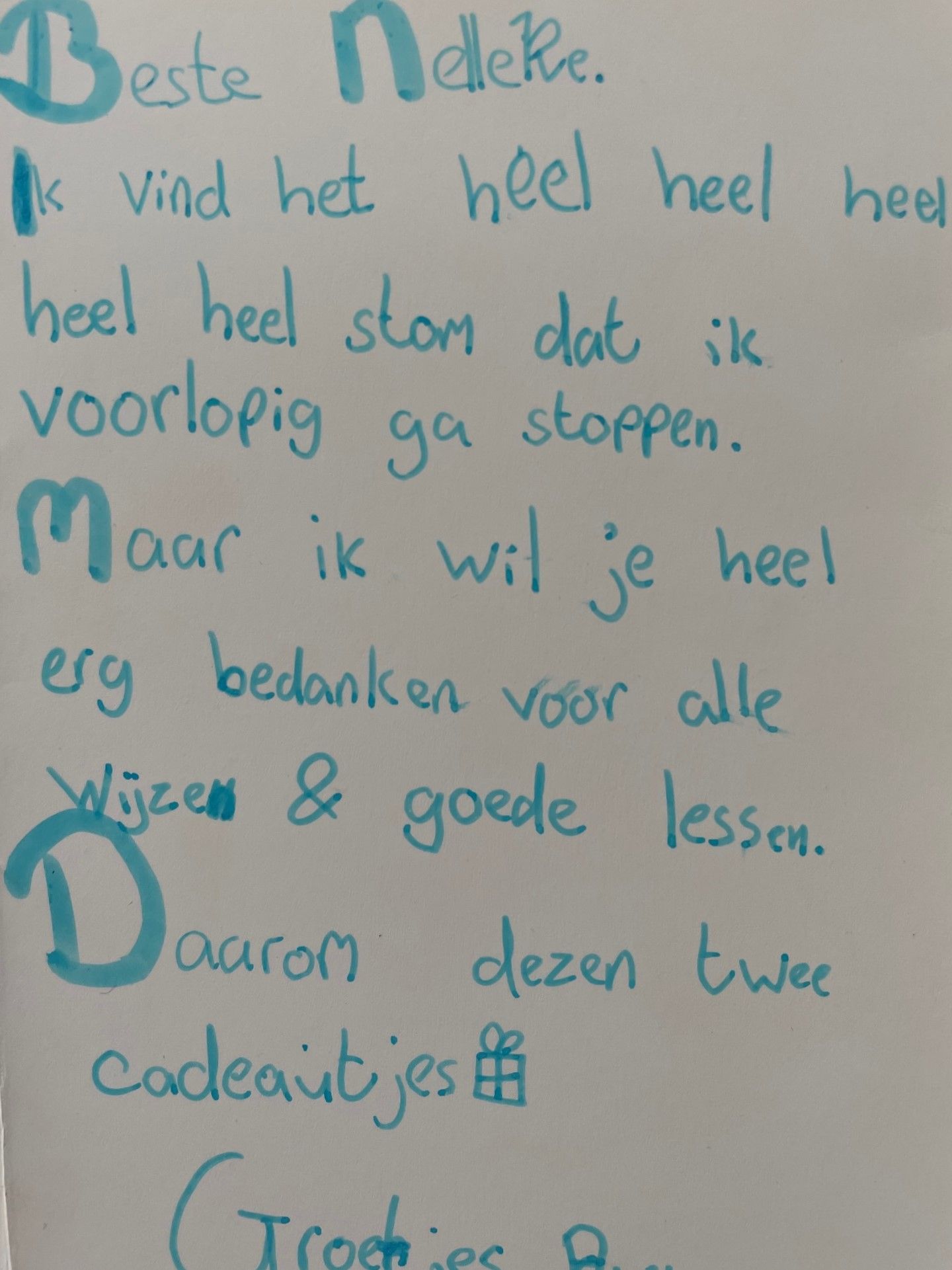 Heel erg bedankt Nelleke voor je fantastische begeleiding van M. de afgelopen jaren. Veel van wat hij heeft geleerd is dankzij jou, met veel geduld en humor.